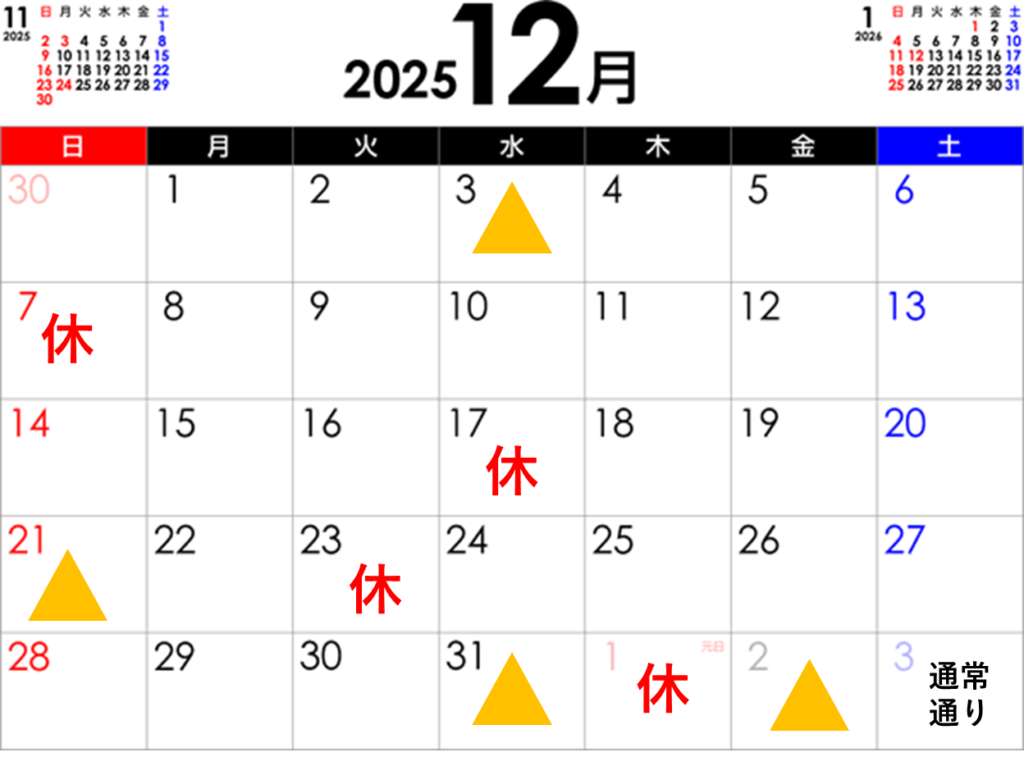 12月のお休みと、年末年始の予定を以下にお知らせいたします。